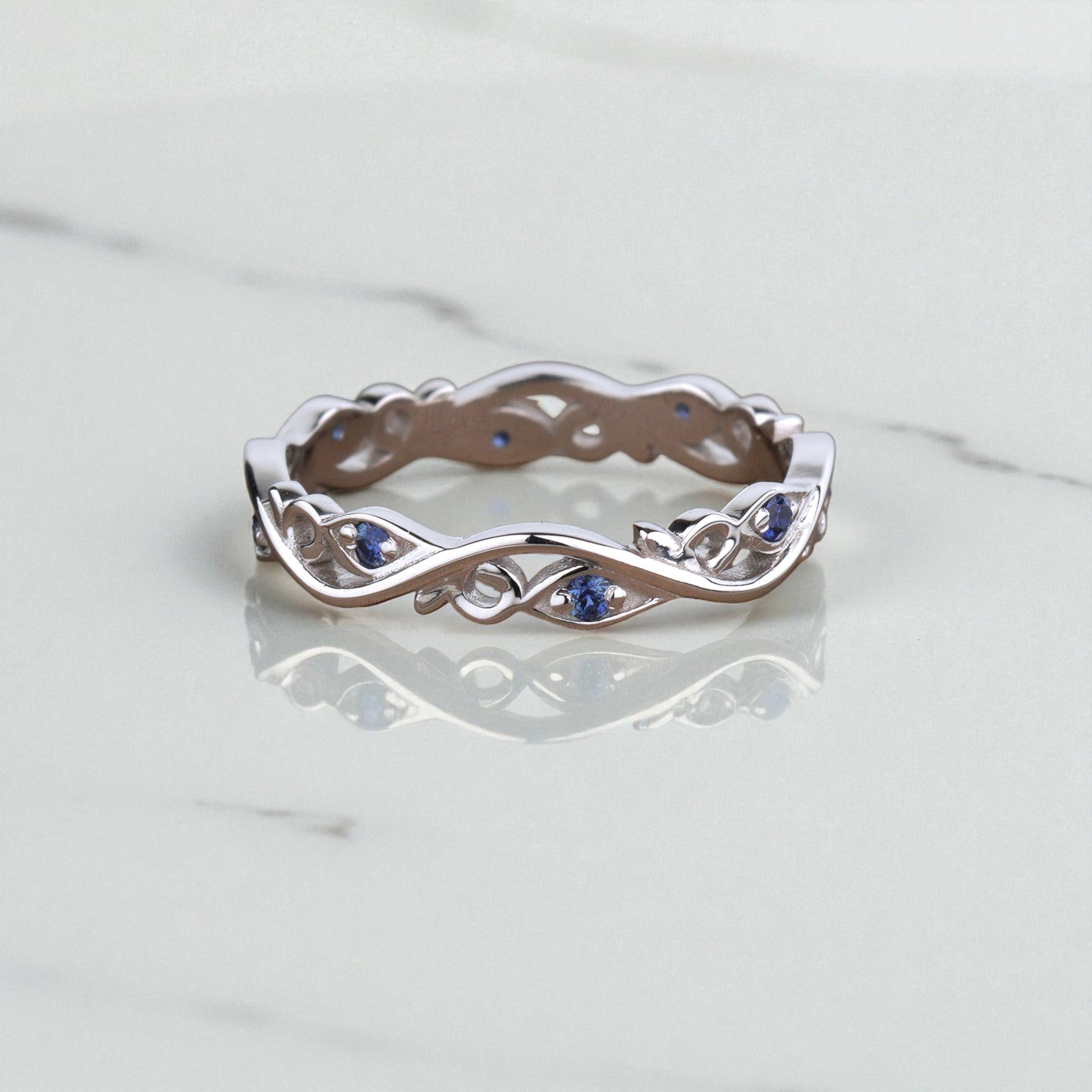 Minimalistyczna obrączka w kwiaty z szafirami to delikatna biżuteria o ponadczasowym charakterze. Wykonana ze złota próby 585, ozdobiona subtelnymi kwiatowymi detalami i niebieskimi szafirami, emanuje elegancją, spokojem i harmonią.