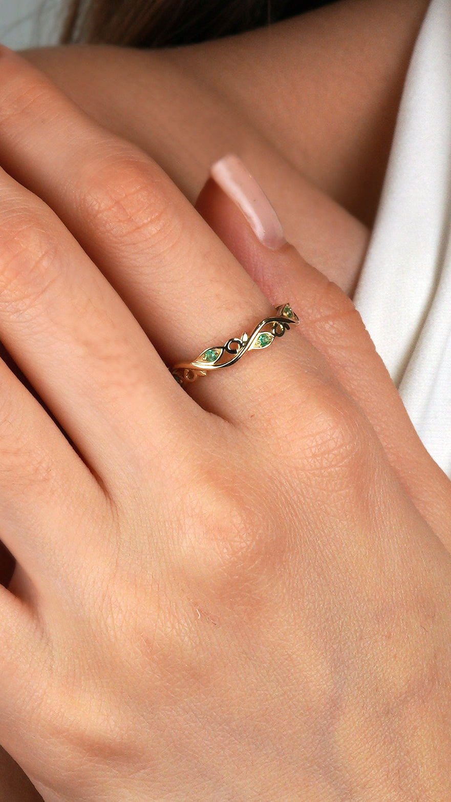 Szmaragdy symbolizują odrodzenie, miłość i harmonię, dzięki czemu ta obrączka stanowi nie tylko piękną ozdobę, ale też talizman o pozytywnej energii. Idealna jako prezent lub wyjątkowy pierścionek na co dzień — dodaje klasy i podkreśla indywidualny styl.
